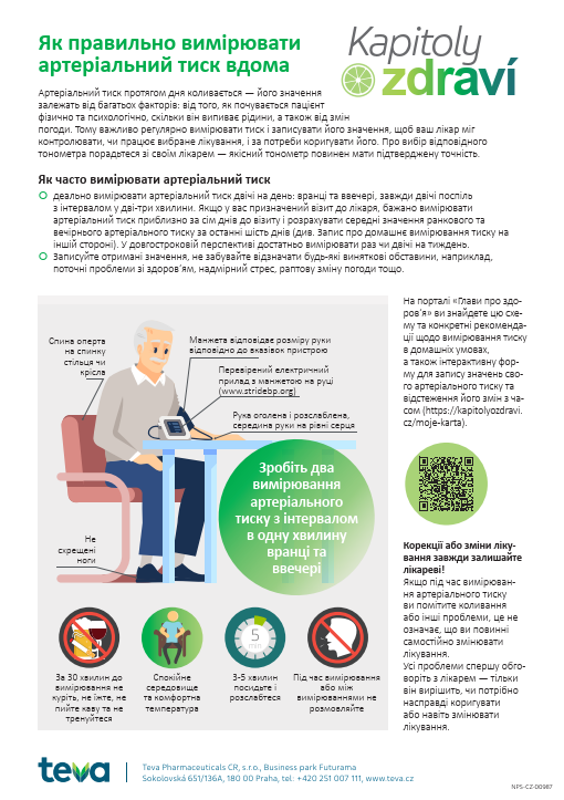 Leták Jak si doma správně měřit tlak včetně Záznamu o domácím měření tlaku v ukrajinštině